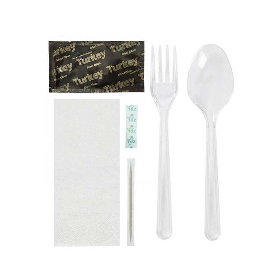 Gelince Haber VerUltra lüks şeffaf plastik çatal, ultra lüks şeffaf plastik kaşık, peçete, tuz ve jelatinli kürdandan oluşan, ıslak mendil 6 parça paket servis yemek setidir.