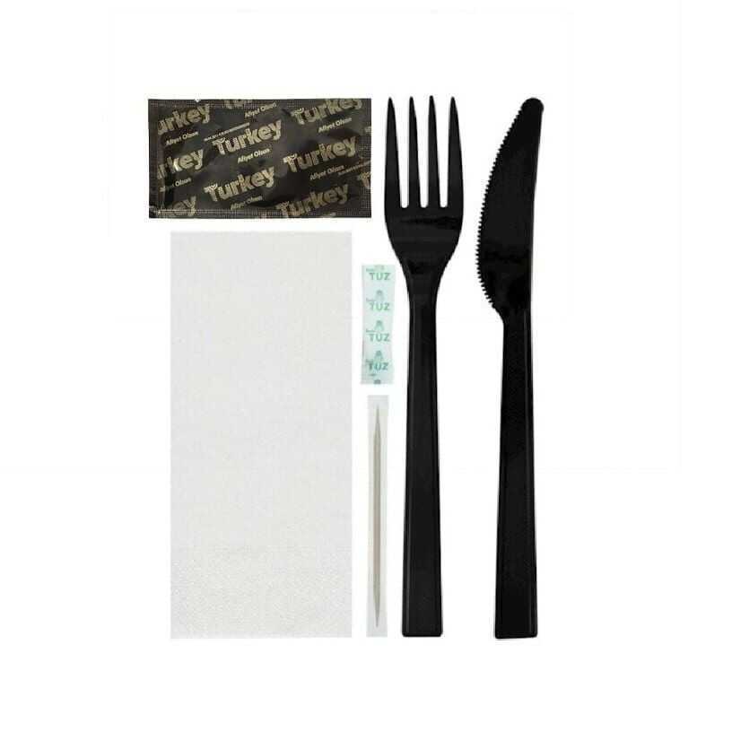 Gelince Haber VerUltra Lüks siyah plastik çatal, lüks siyah plastik bıçak, peçete, tuz ve jelatinli kürdandan oluşan, ıslak mendil 6 parça paket servis yemek setidir.