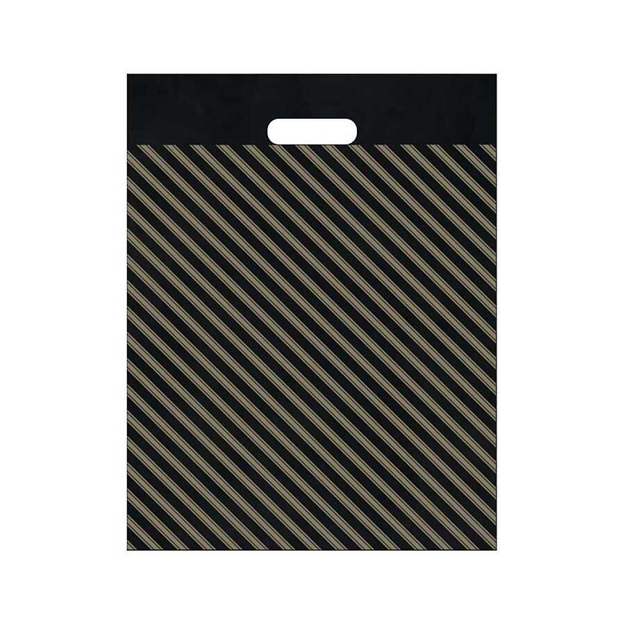 No:5 olarak bilinen 50x60 cm ölçüsünde, siyah zemin üzerine altın yaldız çizgi baskılı hışır poşet; hediyelik eşya, giyim sektörlerinde kullanıma uygun olup, hem şık hem de ekonomik bir paketleme sağlamaktadır.